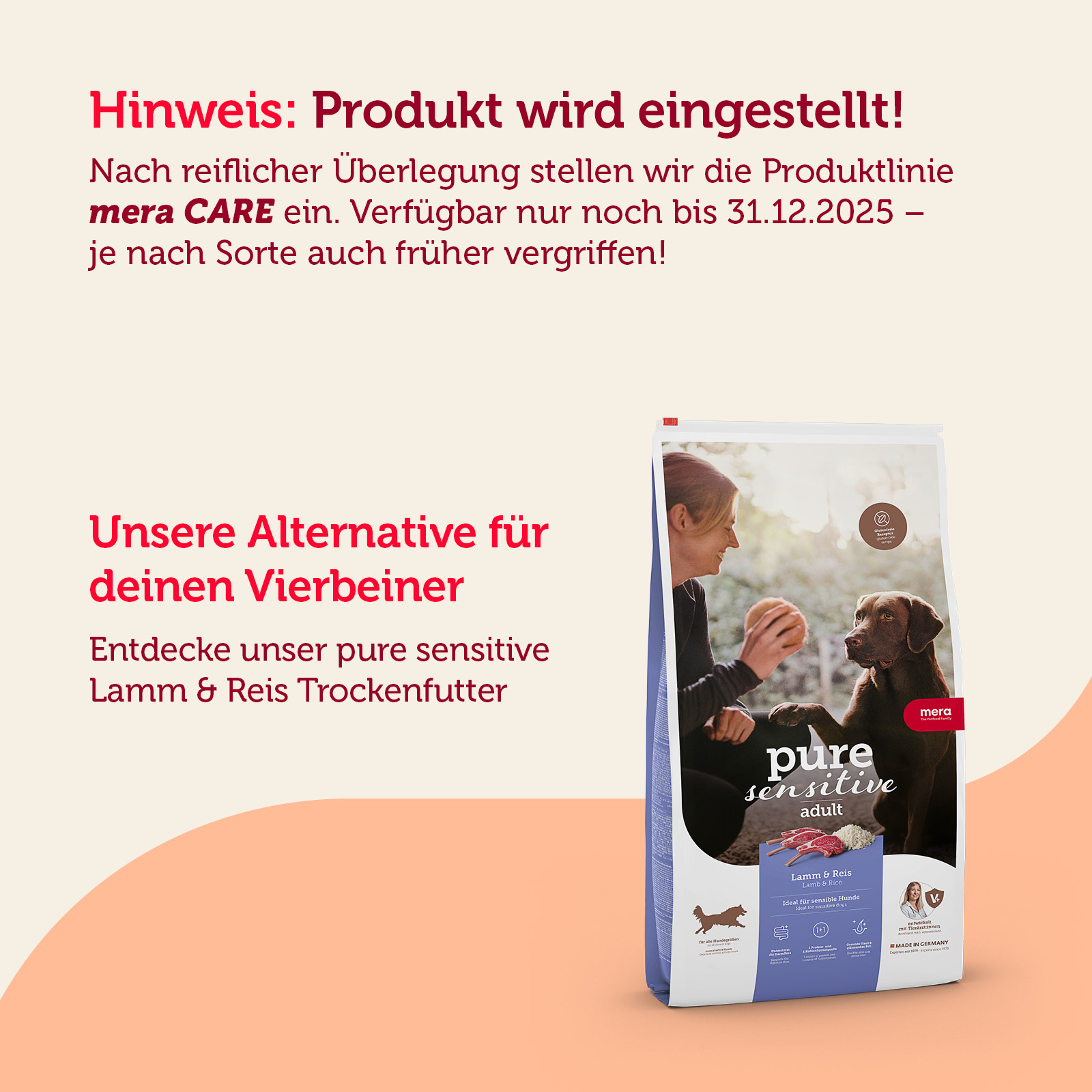 Nach reiflicher Überlegung verabschieden wir uns zum 31.12.2025 von unserer Produktlinie mera CARE. Da alle Sorten nach und nach abverkauft werden, kann es sein, dass einzelne Produkte auch schon früher vergriffen sind. Keine Sorge: Bei uns findest du weiterhin hochwertige Alternativen – z. B. unsere Linie pure sensitive, die sich bereits bei vielen Hunden bewährt hat.