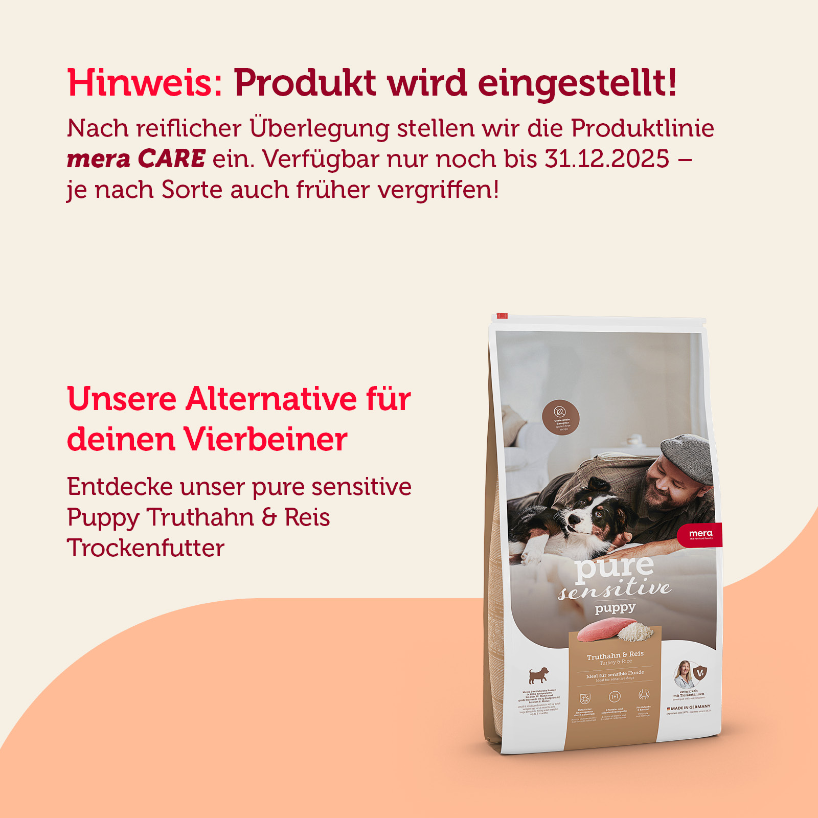 Nach reiflicher Überlegung verabschieden wir uns zum 31.12.2025 von unserer Produktlinie mera CARE. Da alle Sorten nach und nach abverkauft werden, kann es sein, dass einzelne Produkte auch schon früher vergriffen sind. Keine Sorge: Bei uns findest du weiterhin hochwertige Alternativen – z. B. unsere Linie pure sensitive, die sich bereits bei vielen Hunden bewährt hat.