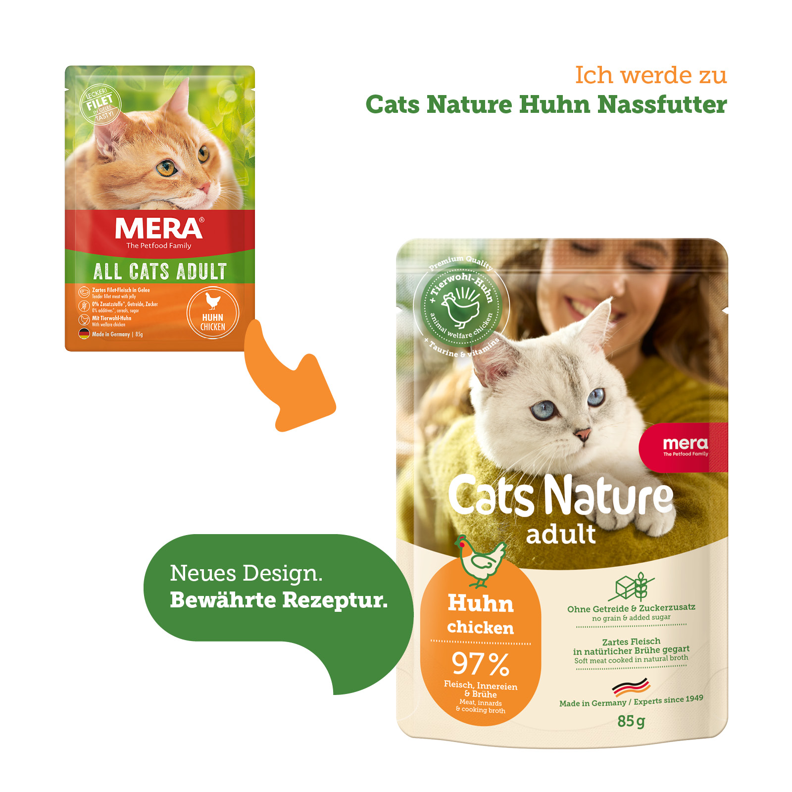 Entdecke das schmackhafte und nachhaltige Nassfutter von mera Cats Nature, speziell entwickelt für die Ernährungsbedürfnisse von Katzen ab dem Alter von 12 Monaten.
