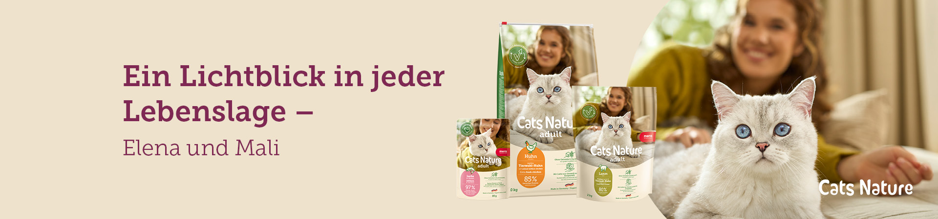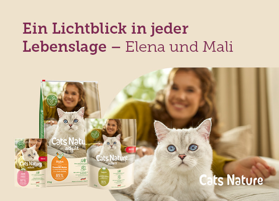 Mit einem hohen Anteil an tierischen Proteinen, frischem Fleisch oder Fisch, Tierwohl-Huhn und weiteren wertvollen Zutaten ganz ohne Getreide-, Zuckerzusatz sowie Farb- und Konservierungsstoffe, ist dieses Futter perfekt auf die Bedürfnisse von aktiven Katzen abgestimmt. Hergestellt in Deutschland und nachhaltig produziert, vereint Cats Nature Adult höchste Qualität mit Verantwortungsbewusstsein – genau wie Elena es für Mali möchte.