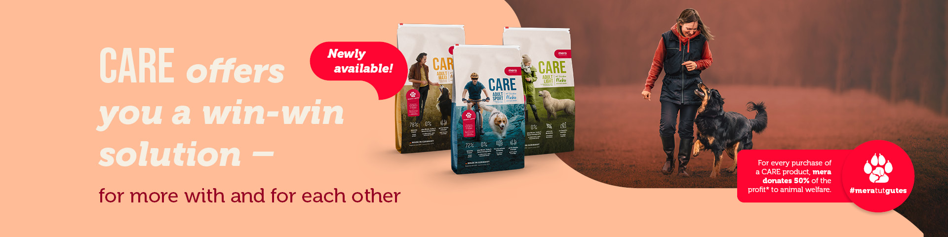 CARE by mera is a valuable addition to the mera product family. CARE is our premium feed that not only has outstanding product features, and therefore benefits your dog, mera also supports animal welfare with every bag you purchase: